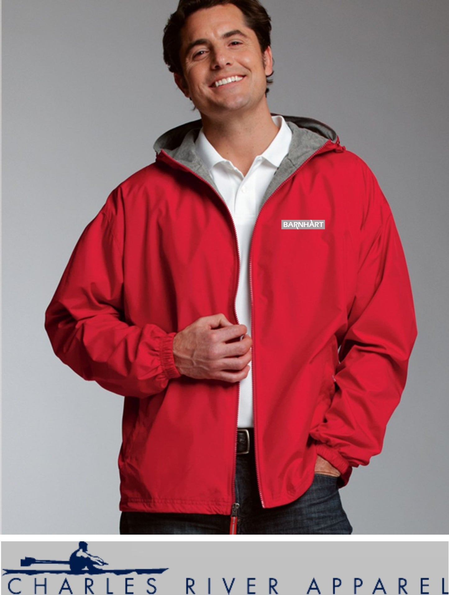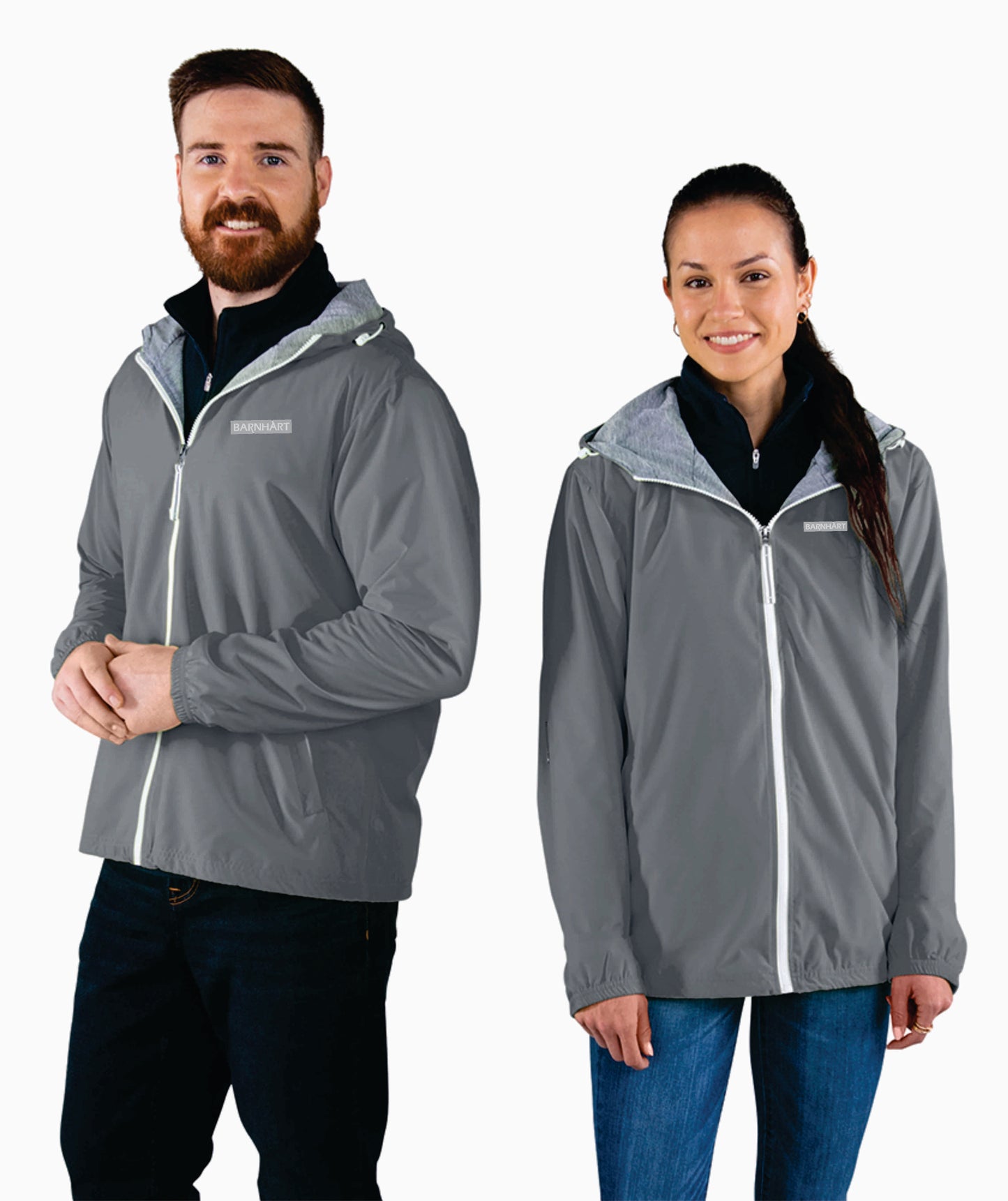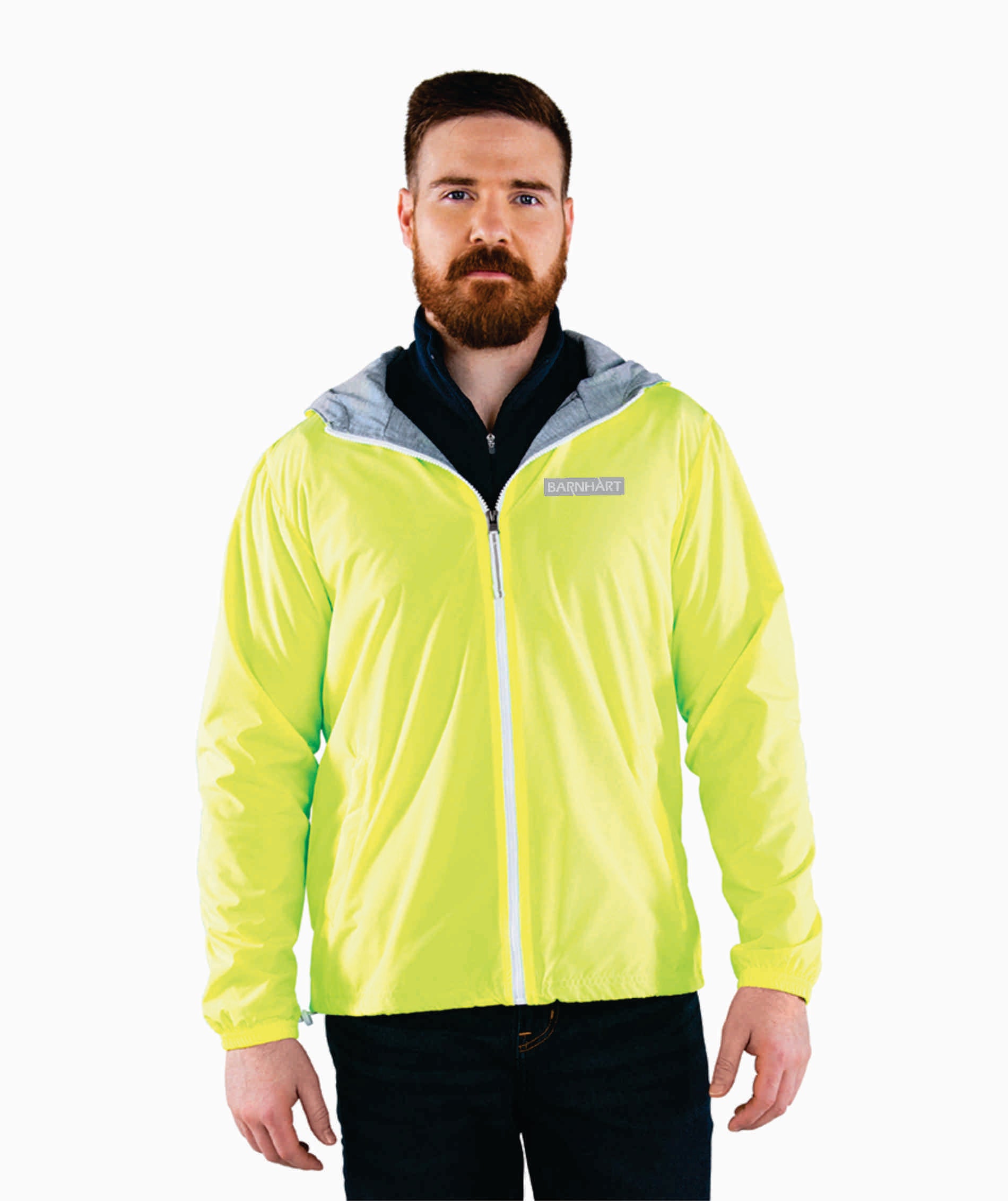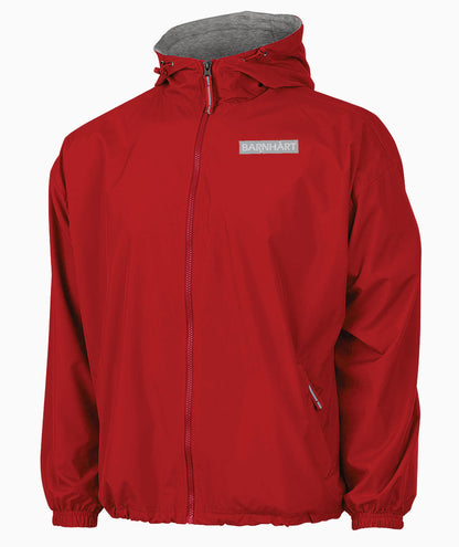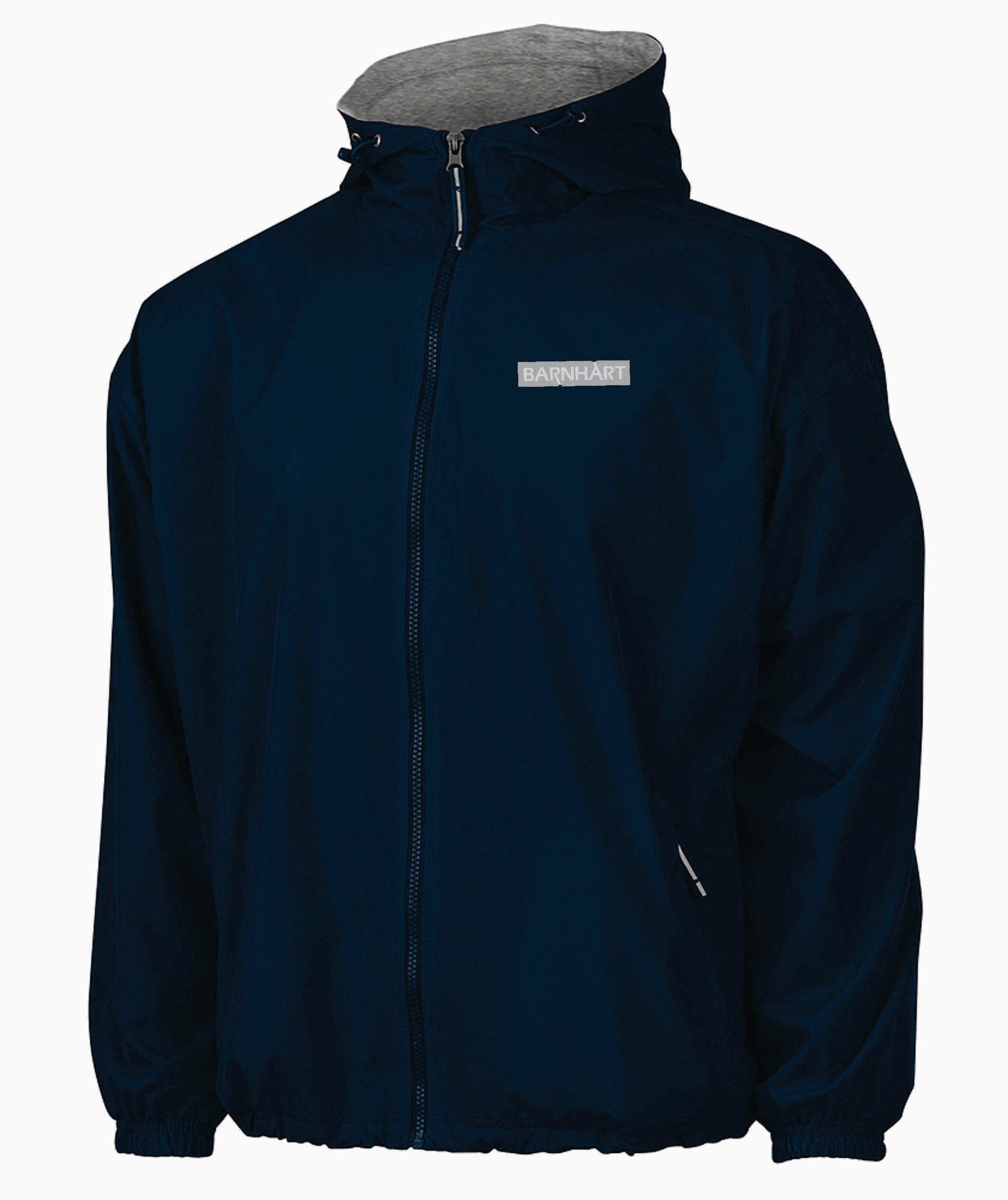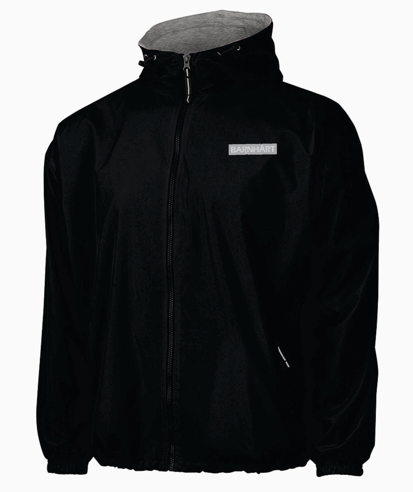 Wind & water-resistant Softex Polyester with oxford grey jersey lining. Hooded full zip design with reflective, easy grab zipper pulls. Covered zippered side pockets & elasticized cuffs. Open hem with shockcord drawstring.